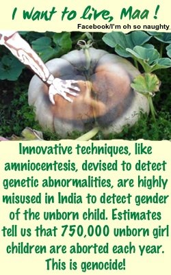 Another issue that I have with the term female feticide and the ways that we talk about it are that it’s hard not to feel like this is an effort by the pro-life groups to try to get feminists and liberal left-wingers on board with the idea that abortions are wrong. It kind of happens in baby steps, you know? First we say that one type of abortion is wrong and should be made illegal, and then another, until finally the procedure is outlawed altogether. I mean, it seems very telling that Motion 408 was put forth by a Conservative Party MP, you know? Looking at that graphic above, I can’t help but imagine it without the text at the bottom – just a fetus with the text, I want to live, Maa. Seen that way, it bears a striking resemblance to a lot of the pro-life rhetoric.