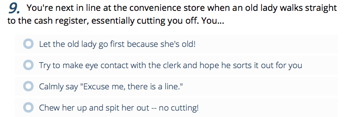 I haven’t seen this quiz show up on my newsfeed yet, but if it does, I’ll definitely take it. Based on the sample questions you gave, I’ll probably come up 95-100% bitch, and I’ll take it as a compliment. Because according to this quiz being a “bitch” means standing up for yourself and, in response to questions 3 and 4, I don’t know…responding to situations the way a normal person would?