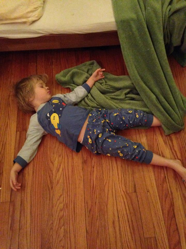 Speaking of sleep, I should probably mention that you still hate it. Your bedtime-delaying tactics are impressive – just another glass of milk, just another cuddle, you just need to tell me something, you don’t want your nightlight, no wait now you do want your nightlight, nope actually you don’t want your nightlight and you have to make two trips to give it to me because the first time you forgot to bring the charging cord that was still plugged into the wall. You also hate sleeping in your bed, and for some reason seem to prefer the floor – especially “the crack,” a space that you create by pulling your bed away from the wall.