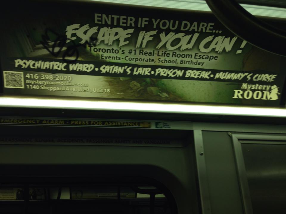 I am writing with regards to the following poster found in some of your subway cars advertising “Mystery Room,” which is apparently a sort of spooky role-playing game where you have to escape scary situations.